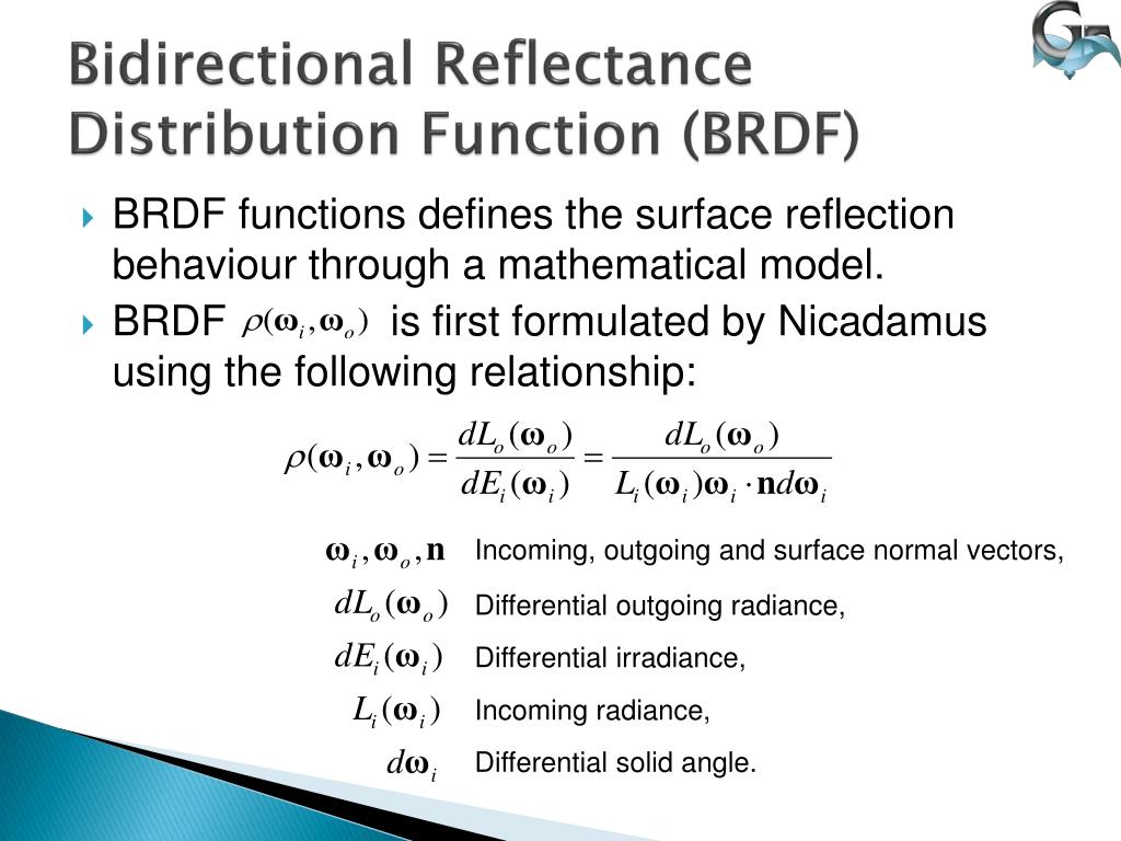 BidirectionalReflectanceDistributionFunction (BRDF) • BRDF functionsdefinesthesurfacereflectionbehaviourthrough a mathematical model. • BRDF is firstformulatedbyNicadamususingthefollowingrelationship: Incoming, outgoingandsurface normal vectors, Differentialoutgoingradiance, Differentialirradiance, Incomingradiance, Differentialsolidangle.