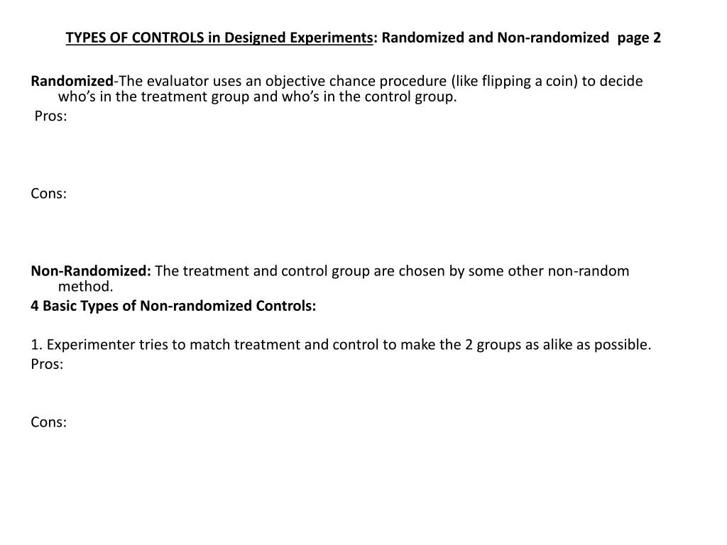 TYPES OF CONTROLS in Designed Experiments: Randomized and Non-randomized page 2 Randomized-The evaluator uses an objective chance procedure (like flipping a coin) to decide who’s in the treatment group and who’s in the control group. Pros: Cons: Non-Randomized: The treatment and control group are chosen by some other non-random method. 4 Basic Types of Non-randomized Controls: 1. Experimenter tries to match treatment and control to make the 2 groups as alike as possible. Pros: Cons: