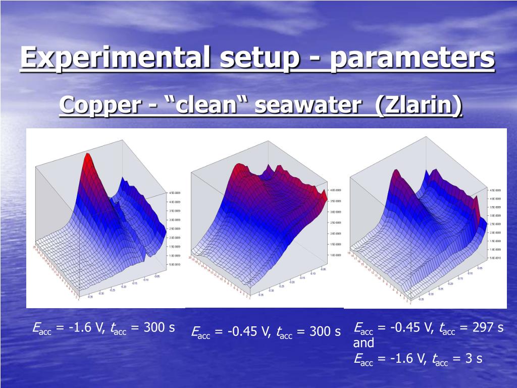 Experimental setup - parameters Copper - “clean“ seawater (Zlarin) Eacc = -1.6 V, tacc = 300 s Eacc = -0.45 V, tacc = 297 s and Eacc = -1.6 V, tacc = 3 s Eacc = -0.45 V, tacc = 300 s