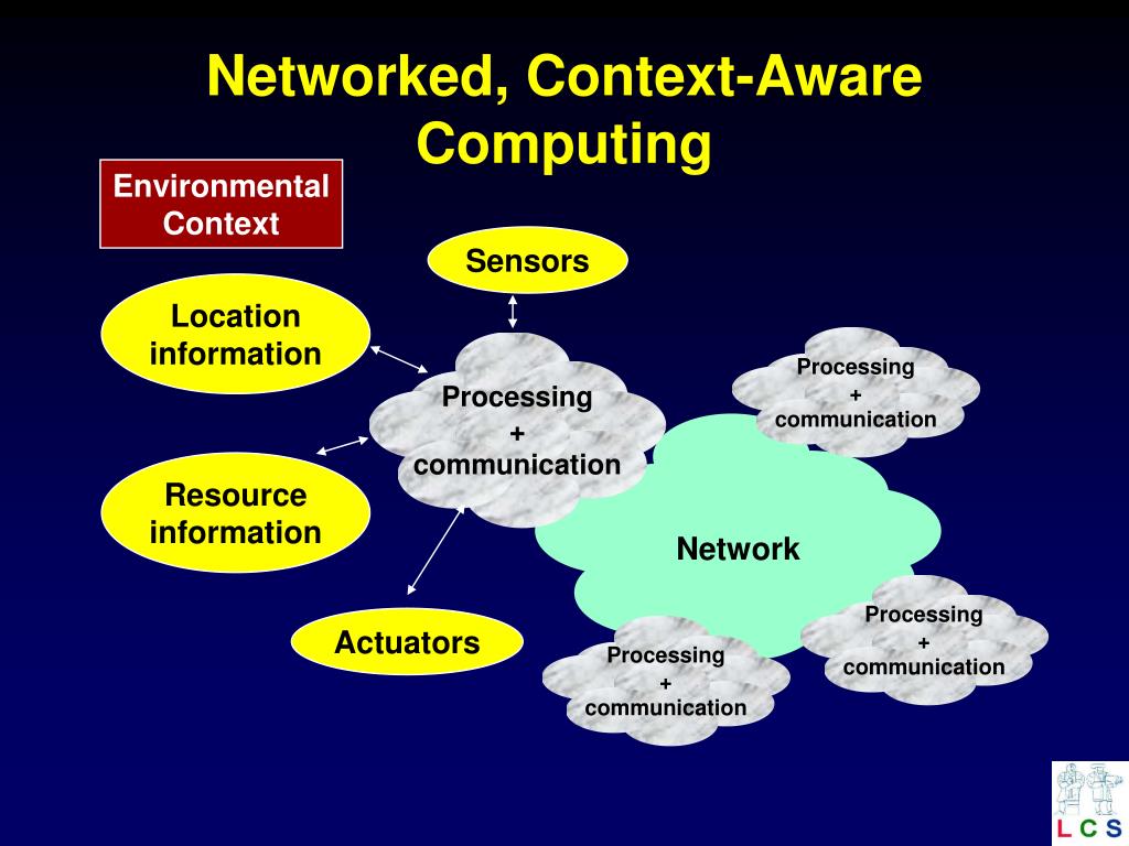 Sensors Processing + communication Processing + communication Processing + communication Location information Processing + communication Resource information Network Actuators Networked, Context-Aware Computing Environmental Context