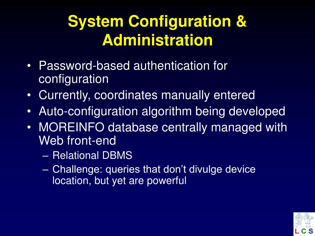 System Configuration & Administration • Password-based authentication for configuration • Currently, coordinates manually entered • Auto-configuration algorithm being developed • MOREINFO database centrally managed with Web front-end • Relational DBMS • Challenge: queries that don’t divulge device location, but yet are powerful