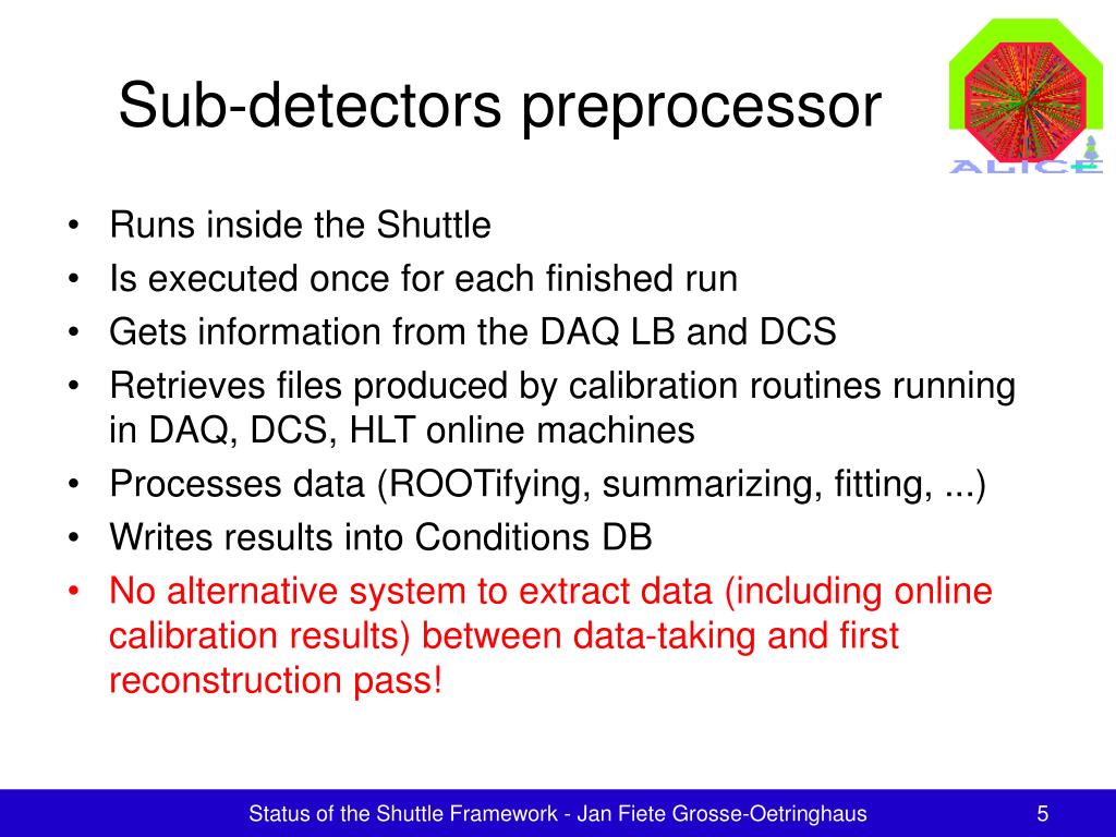 Sub-detectors preprocessor • Runs inside the Shuttle • Is executed once for each finished run • Gets information from the DAQ LB and DCS • Retrieves files produced by calibration routines running in DAQ, DCS, HLT online machines • Processes data (ROOTifying, summarizing, fitting, ...) • Writes results into Conditions DB • No alternative system to extract data (including online calibration results) between data-taking and first reconstruction pass! Status of the Shuttle Framework - Jan Fiete Grosse-Oetringhaus
