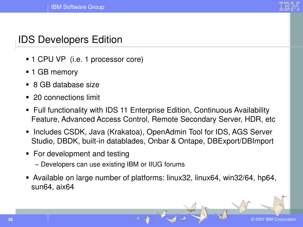 Announcing the new IDS Developer Edition Announcing the new IDS Developers Edition • Promote application development and facilitate BP recruitment • Drive market share and future revenue growth • Free of charge, development use only edition • No support, no production use • Redistribution requires explicit IBM approval • Available to all potential customers, applications developers, and BPs