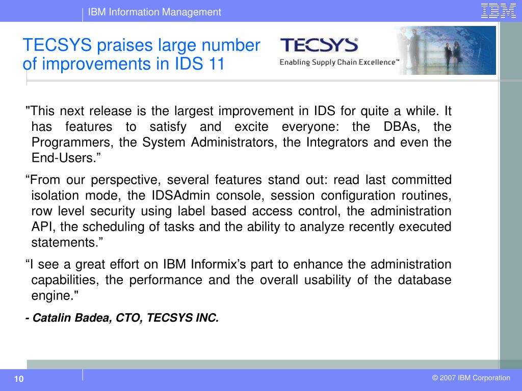 TECSYS praises large number of improvements in IDS 11 "This next release is the largest improvement in IDS for quite a while. It has features to satisfy and excite everyone: the DBAs, the Programmers, the System Administrators, the Integrators and even the End-Users.” “From our perspective, several features stand out: read last committed isolation mode, the IDSAdmin console, session configuration routines, row level security using label based access control, the administration API, the scheduling of tasks and the ability to analyze recently executed statements.” “I see a great effort on IBM Informix’s part to enhance the administration capabilities, the performance and the overall usability of the database engine." - Catalin Badea, CTO, TECSYS INC.