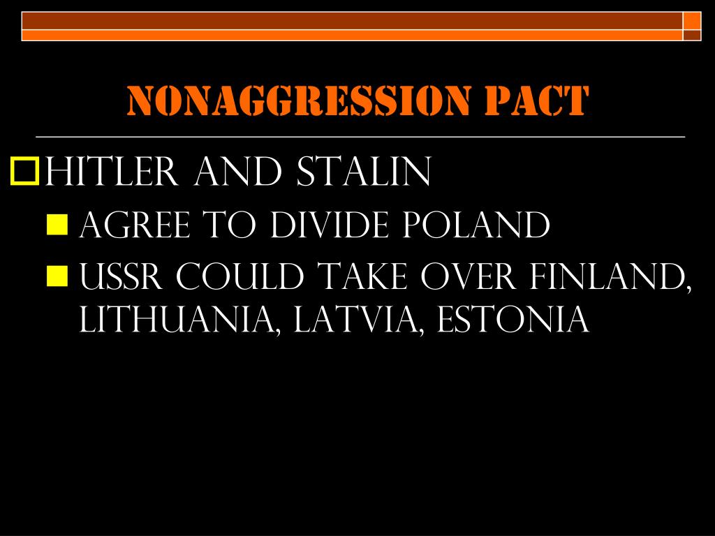 NonAggression pact • Hitler and Stalin • Agree to divide poland • USSR could take over finland, lithuania, Latvia, Estonia