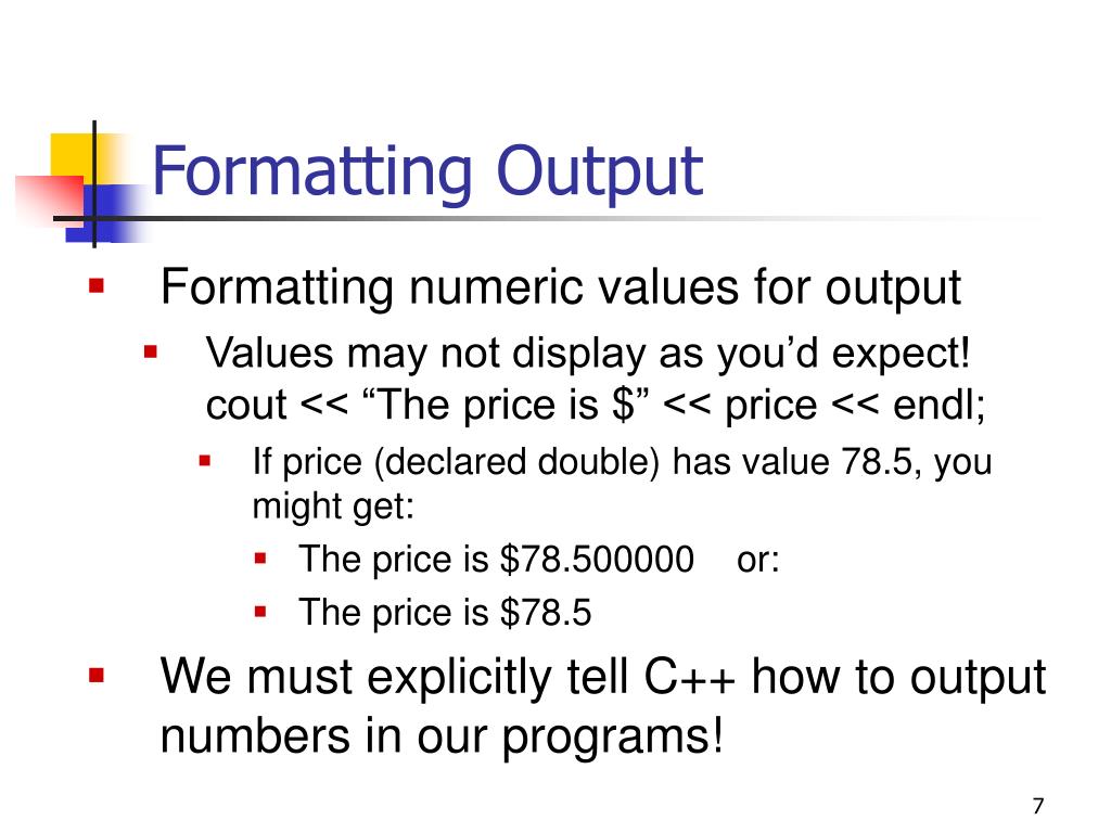 Formatting Output • Formatting numeric values for output • Values may not display as you’d expect!cout << “The price is $” << price << endl; • If price (declared double) has value 78.5, youmight get: • The price is $78.500000 or: • The price is $78.5 • We must explicitly tell C++ how to outputnumbers in our programs!