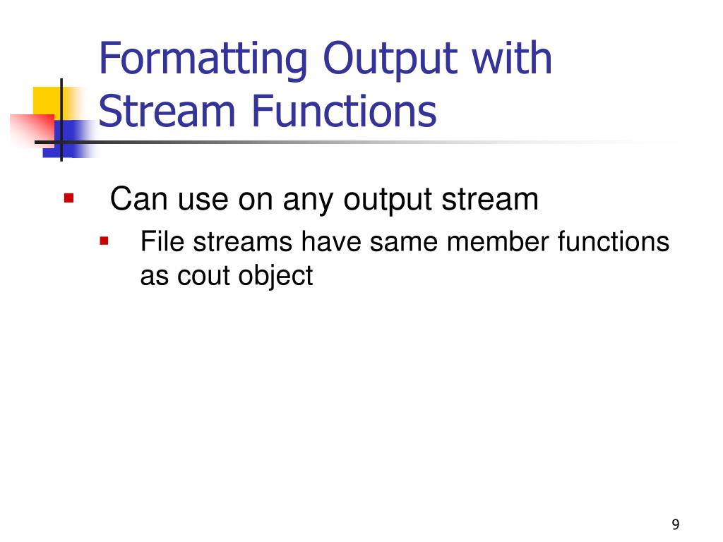 Formatting Output with Stream Functions • Can use on any output stream • File streams have same member functionsas cout object