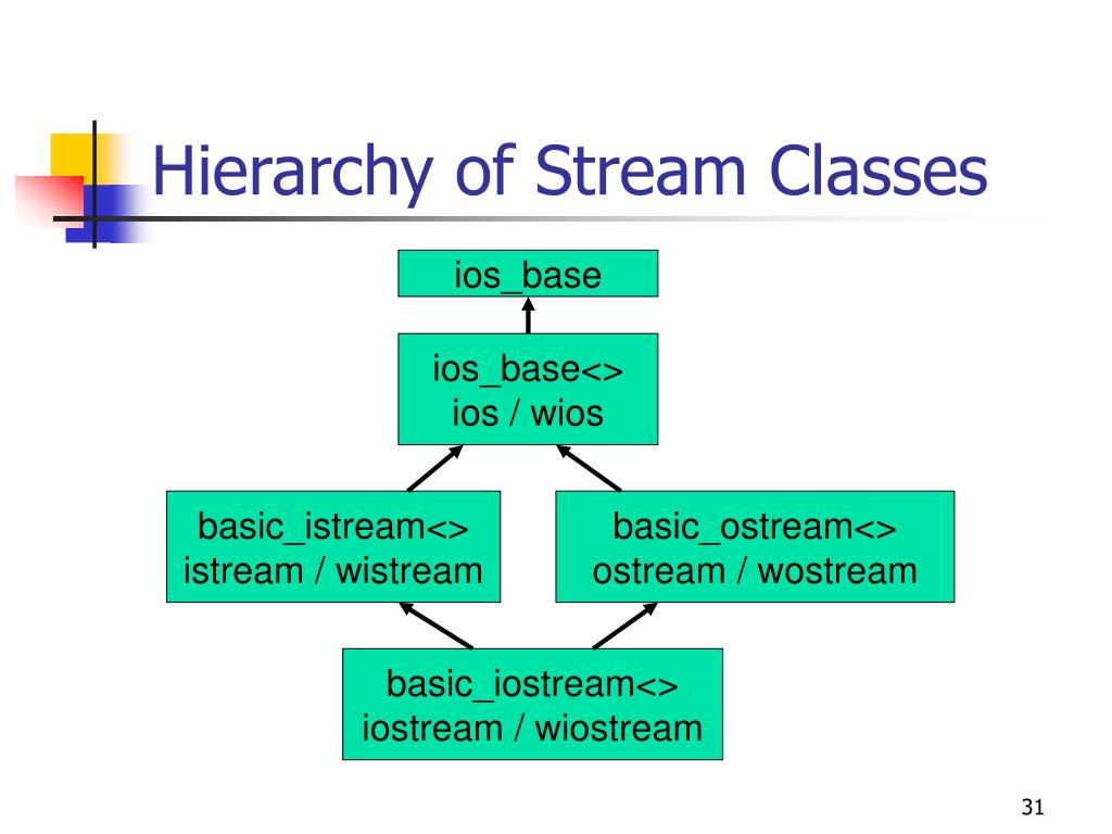 ios_base ios_base<> ios / wios basic_istream<> istream / wistream basic_ostream<> ostream / wostream basic_iostream<> iostream / wiostream Hierarchy of Stream Classes