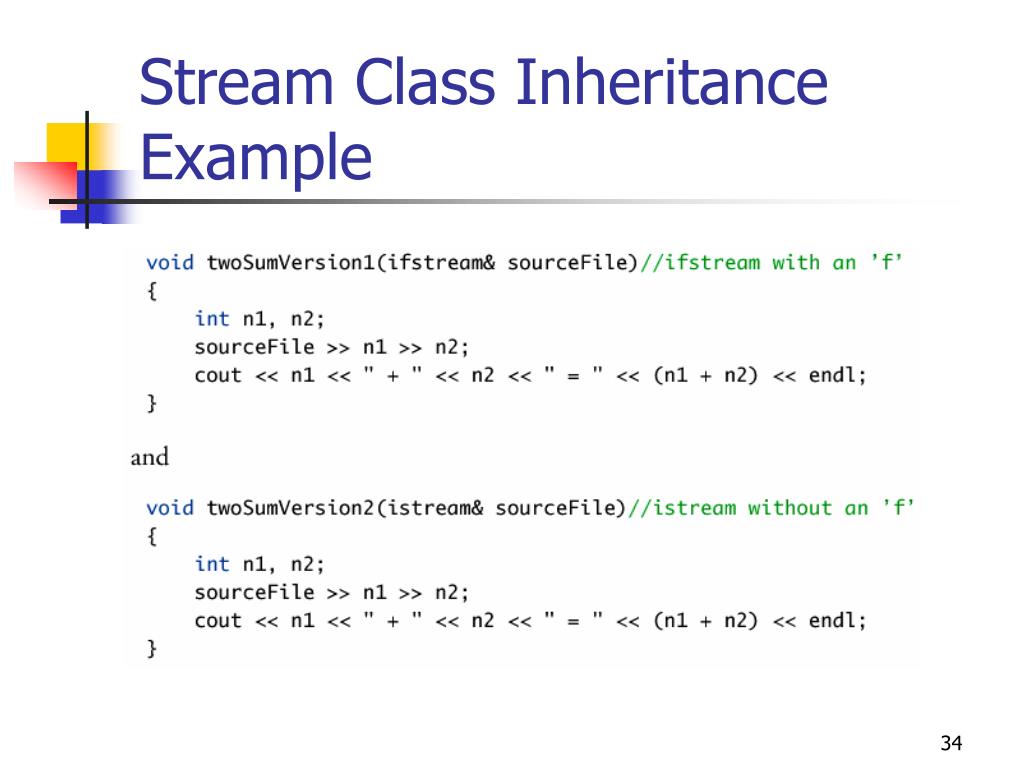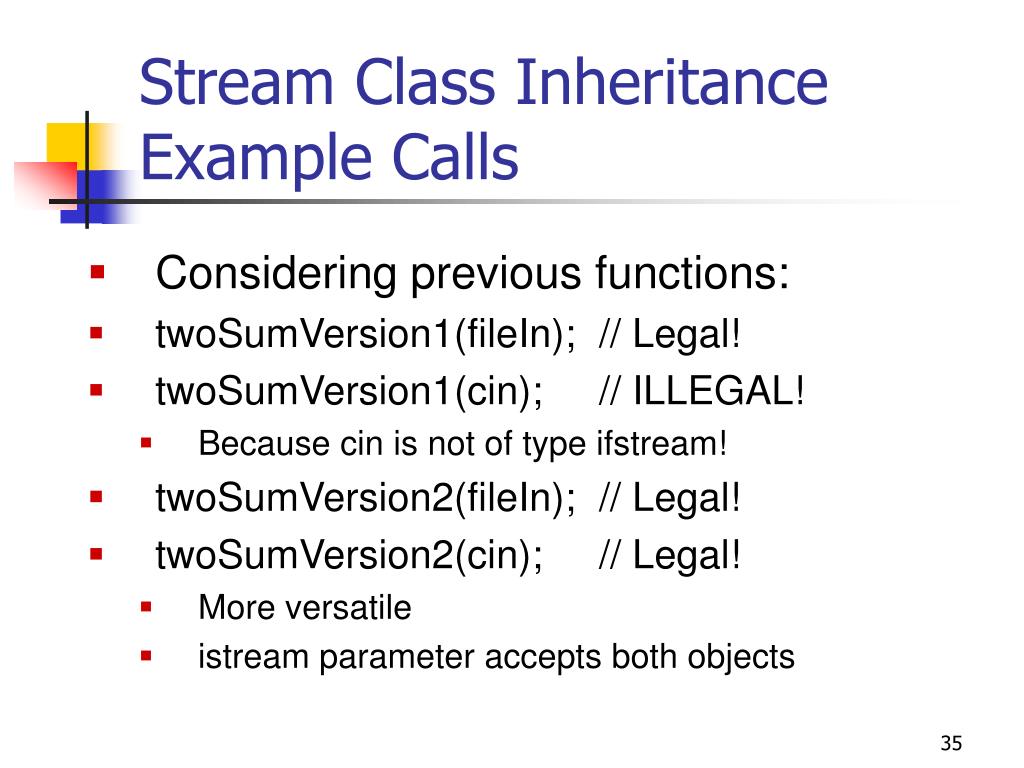 Stream Class Inheritance Example Calls • Considering previous functions: • twoSumVersion1(fileIn); // Legal! • twoSumVersion1(cin); // ILLEGAL! • Because cin is not of type ifstream! • twoSumVersion2(fileIn); // Legal! • twoSumVersion2(cin); // Legal! • More versatile • istream parameter accepts both objects