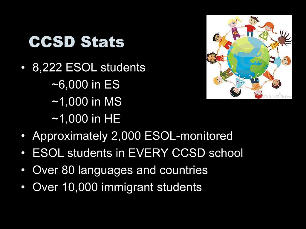 CCSD Stats • 8,222 ESOL students ~6,000 in ES ~1,000 in MS ~1,000 in HE • Approximately 2,000 ESOL-monitored • ESOL students in EVERY CCSD school • Over 80 languages and countries • Over 10,000 immigrant students