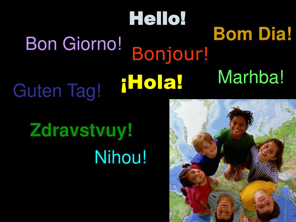 Bom Dia! Bon Giorno! Hello! Bonjour! ¡Hola! Marhba! Guten Tag! Zdravstvuy! Nihou!