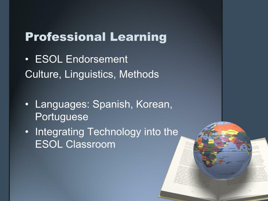 Professional Learning • ESOL Endorsement Culture, Linguistics, Methods • Languages: Spanish, Korean, Portuguese • Integrating Technology into the ESOL Classroom