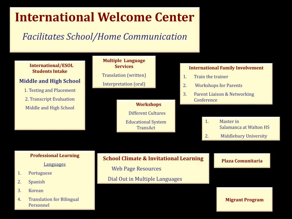 International Welcome Center Facilitates School/Home Communication Multiple Language Services Translation (written) Interpretation (oral) • International/ESOL Students Intake • Middle and High School 1. Testing and Placement 2. Transcript Evaluation Middle and High School • International Family Involvement • Train the trainer • Workshops for Parents • Parent Liaison & Networking Conference Workshops Different Cultures Educational System TransAct Master in Salamanca at Walton HS Middlebury University • Professional Learning • Languages • Portuguese • Spanish • Korean • Translation for Bilingual Personnel School Climate & Invitational Learning Web Page Resources Dial Out in Multiple Languages Plaza Comunitaria Migrant Program