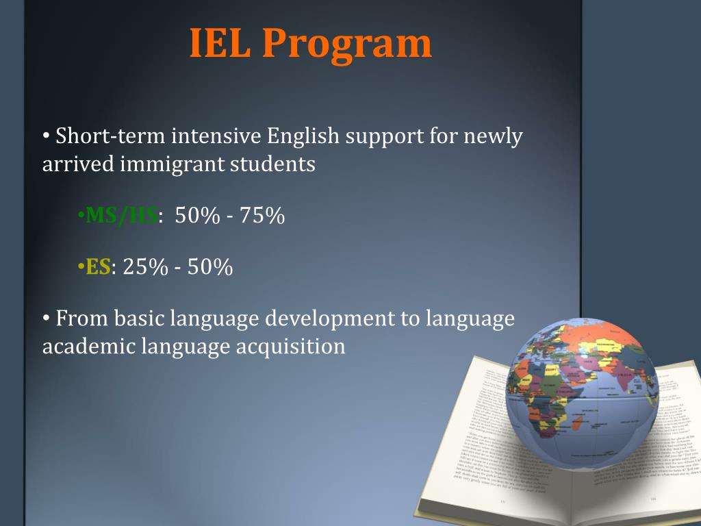 IEL Program • Short-term intensive English support for newly arrived immigrant students • MS/HS: 50% - 75% • ES: 25% - 50% • From basic language development to language academic language acquisition