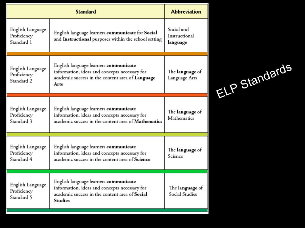 Some Requirements of NCLB... • English language development standards aligned to academic content standards • Participation in state testing • School – Home communication in language that parents understand • Qualification of teachers • Parental Notification