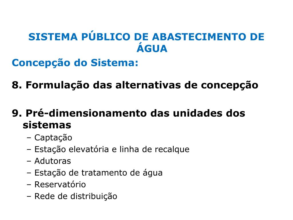 SISTEMA PÚBLICO DE ABASTECIMENTO DE ÁGUA Concepção do Sistema: 8. Formulação das alternativas de concepção 9. Pré-dimensionamento das unidades dos sistemas – Captação – Estação elevatória e linha de recalque – Adutoras – Estação de tratamento de água – Reservatório – Rede de distribuição