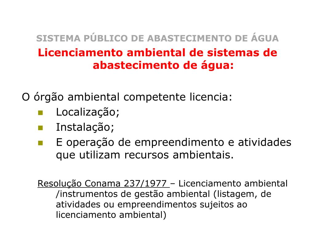 SISTEMA PÚBLICO DE ABASTECIMENTO DE ÁGUA Licenciamento ambiental de sistemas de abastecimento de água: O órgão ambiental competente licencia: • Localização; • Instalação; • E operação de empreendimento e atividades que utilizam recursos ambientais. • Resolução Conama 237/1977 – Licenciamento ambiental /instrumentos de gestão ambiental (listagem, de atividades ou empreendimentos sujeitos ao licenciamento ambiental)