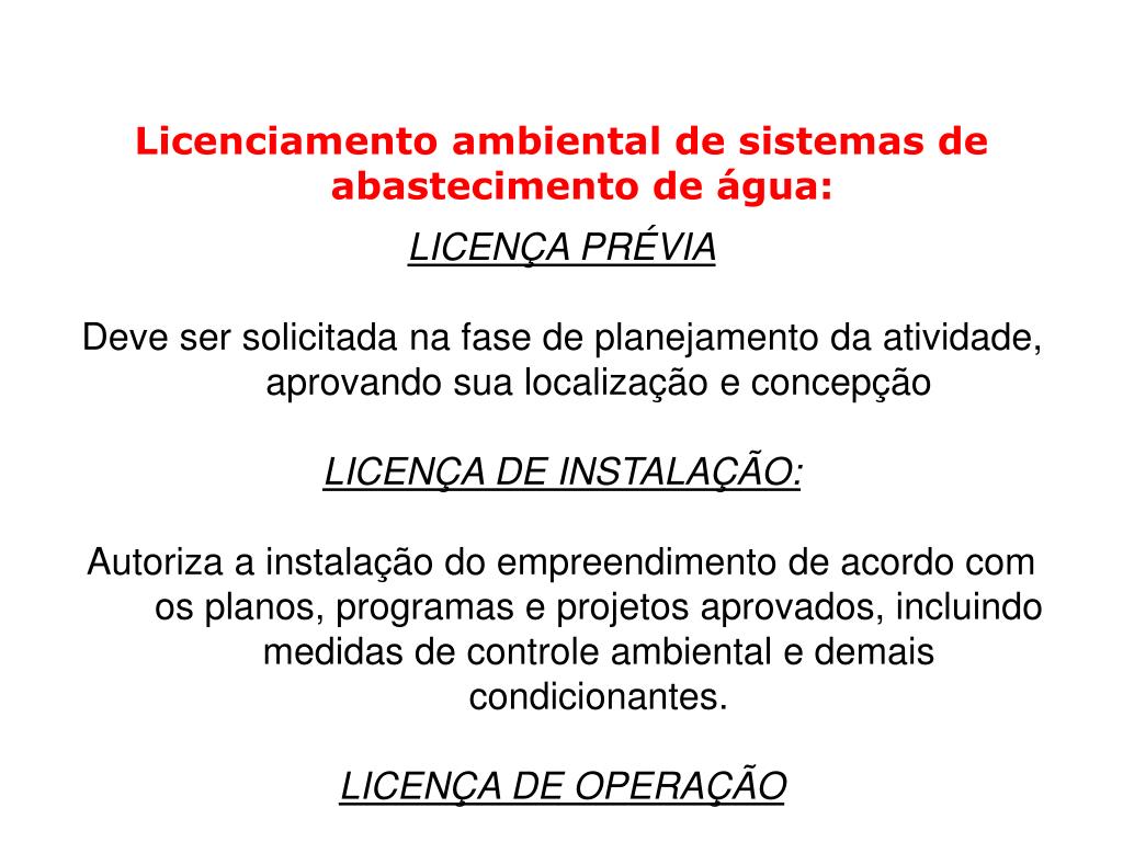 Licenciamento ambiental de sistemas de abastecimento de água: LICENÇA PRÉVIA Deve ser solicitada na fase de planejamento da atividade, aprovando sua localização e concepção LICENÇA DE INSTALAÇÃO: Autoriza a instalação do empreendimento de acordo com os planos, programas e projetos aprovados, incluindo medidas de controle ambiental e demais condicionantes. LICENÇA DE OPERAÇÃO
