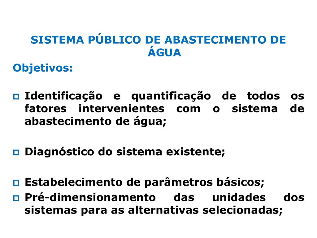 SISTEMA PÚBLICO DE ABASTECIMENTO DE ÁGUA Objetivos: • Identificação e quantificação de todos os fatores intervenientes com o sistema de abastecimento de água; • Diagnóstico do sistema existente; • Estabelecimento de parâmetros básicos; • Pré-dimensionamento das unidades dos sistemas para as alternativas selecionadas;