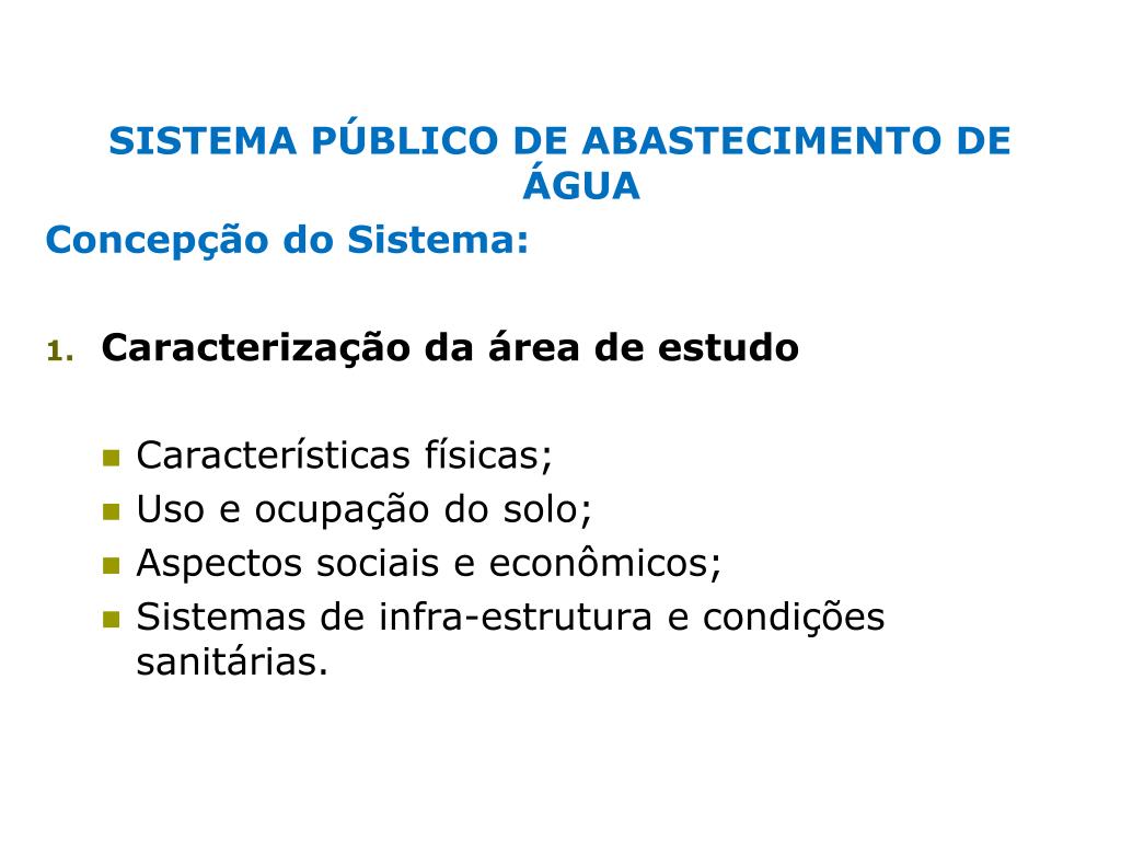 SISTEMA PÚBLICO DE ABASTECIMENTO DE ÁGUA Concepção do Sistema: • Caracterização da área de estudo • Características físicas; • Uso e ocupação do solo; • Aspectos sociais e econômicos; • Sistemas de infra-estrutura e condições sanitárias.