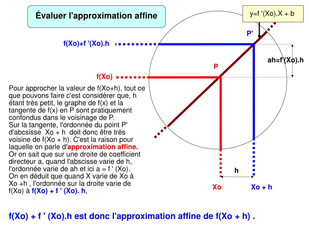 L'approximation affine est un procédé consistant à considérer que dans le voisinage immédiat d'un point (Xo , f(Xo)) du graphe d'une fonction, le graphe et sa tangente sont pratiquement confondus.