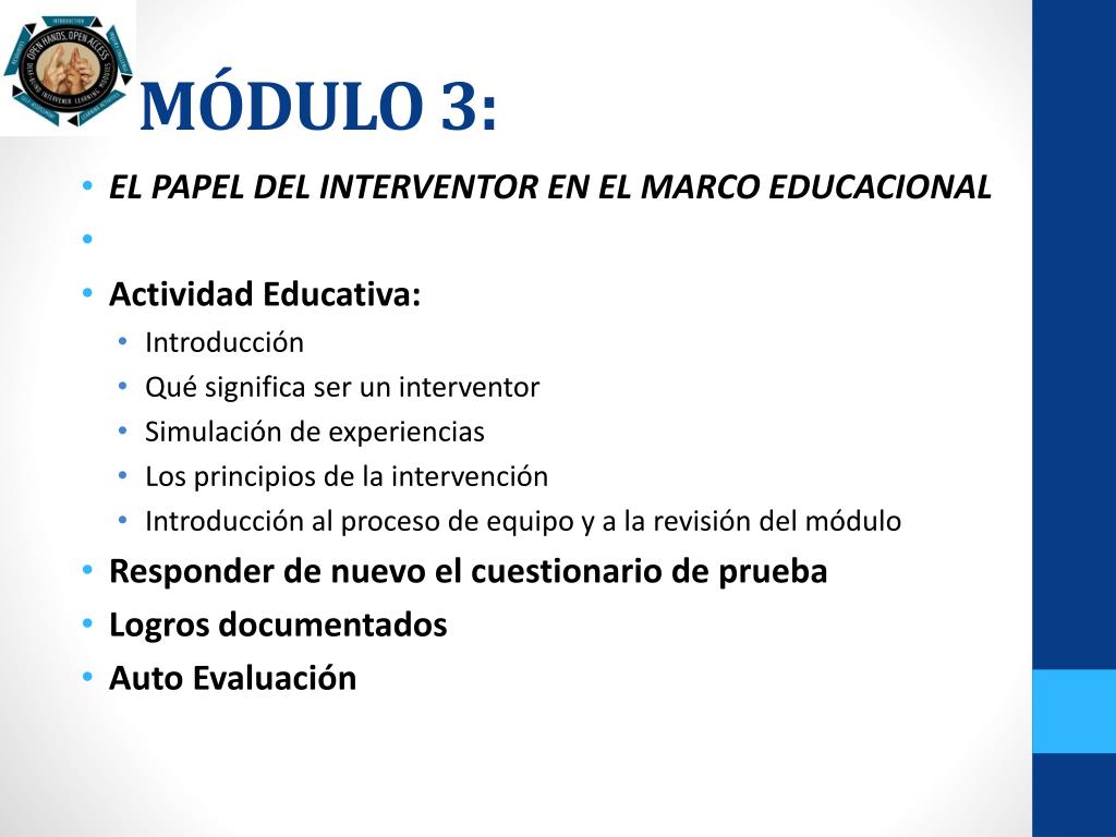 MÓDULO 3: • EL PAPEL DEL INTERVENTOR EN EL MARCO EDUCACIONAL • Actividad Educativa: • Introducción • Qué significa ser un interventor • Simulación de experiencias • Los principios de la intervención • Introducción al proceso de equipo y a la revisión del módulo • Responder de nuevo el cuestionario de prueba • Logros documentados • Auto Evaluación