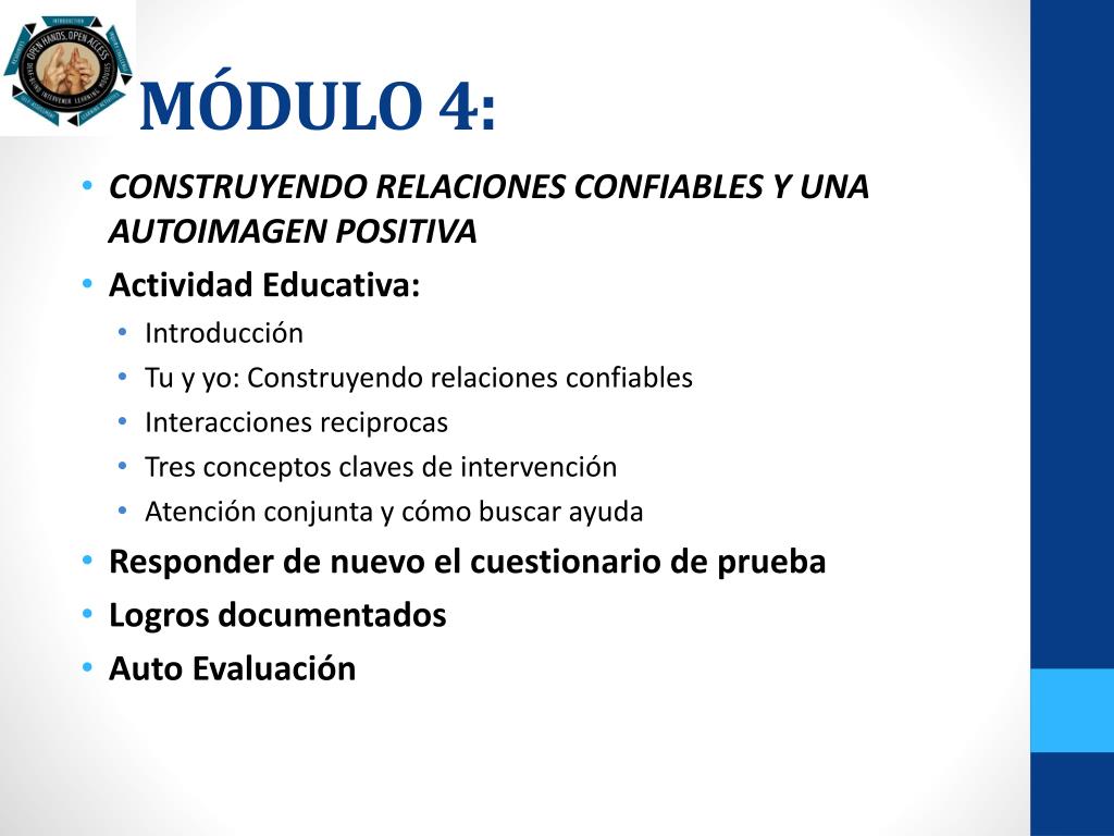 MÓDULO 4: • CONSTRUYENDO RELACIONES CONFIABLES Y UNA AUTOIMAGEN POSITIVA • Actividad Educativa: • Introducción • Tu y yo: Construyendo relaciones confiables • Interacciones reciprocas • Tres conceptos claves de intervención • Atención conjunta y cómo buscar ayuda • Responder de nuevo el cuestionario de prueba • Logros documentados • Auto Evaluación