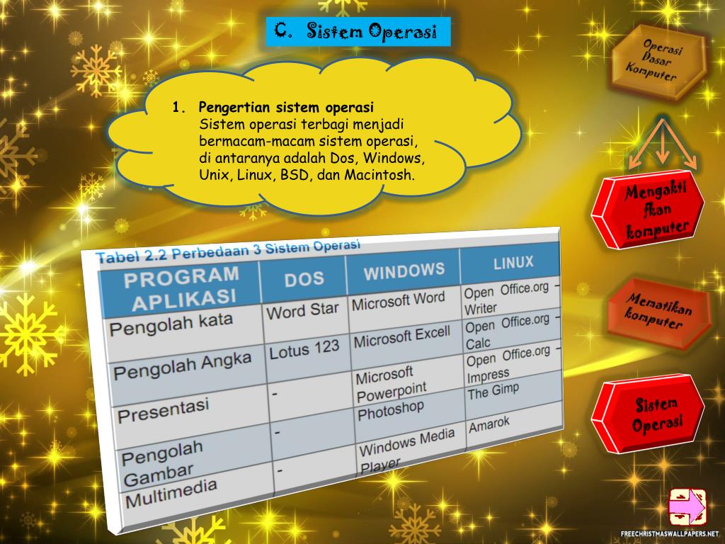 C. Sistem Operasi Operasi Dasar Komputer Pengertian sistem operasi Sistem operasi terbagi menjadi bermacam-macam sistem operasi, di antaranya adalah Dos, Windows, Unix, Linux, BSD, dan Macintosh. Mengaktifkan komputer Mematikan komputer Sistem Operasi