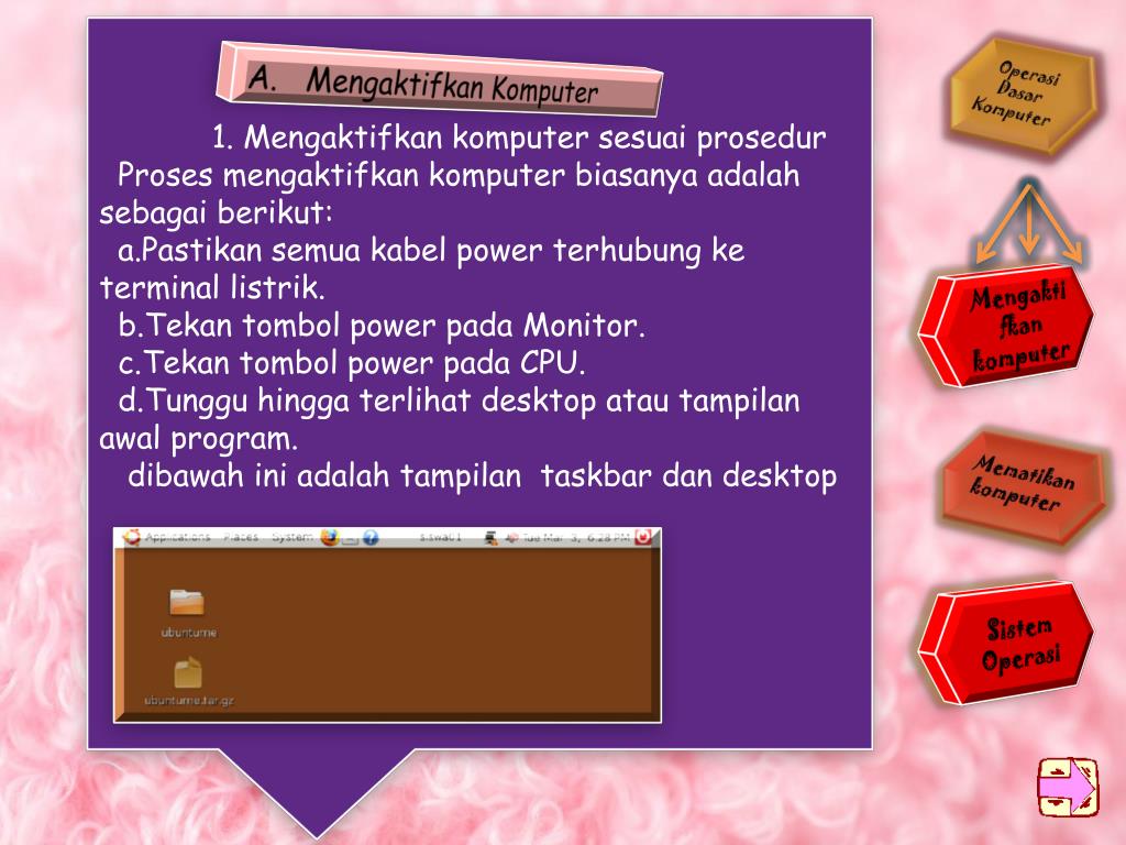 1. Mengaktifkan komputer sesuai prosedur Proses mengaktifkan komputer biasanya adalah sebagai berikut: a.Pastikan semua kabel power terhubung ke terminal listrik. b.Tekan tombol power pada Monitor. c.Tekan tombol power pada CPU. d.Tunggu hingga terlihat desktop atau tampilan awal program. dibawah ini adalah tampilan taskbar dan desktop Operasi Dasar Komputer A. Mengaktifkan Komputer Mengaktifkan komputer Mematikan komputer Sistem Operasi