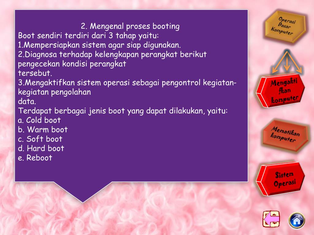 2. Mengenal proses booting Boot sendiri terdiri dari 3 tahap yaitu: 1.Mempersiapkan sistem agar siap digunakan. 2.Diagnosa terhadap kelengkapan perangkat berikut pengecekan kondisi perangkat tersebut. 3.Mengaktifkan sistem operasi sebagai pengontrol kegiatan-kegiatan pengolahan data. Terdapat berbagai jenis boot yang dapat dilakukan, yaitu: a. Cold boot b. Warm boot c. Soft boot d. Hard boot e. Reboot Operasi Dasar Komputer Mengaktifkan komputer Mematikan komputer Sistem Operasi
