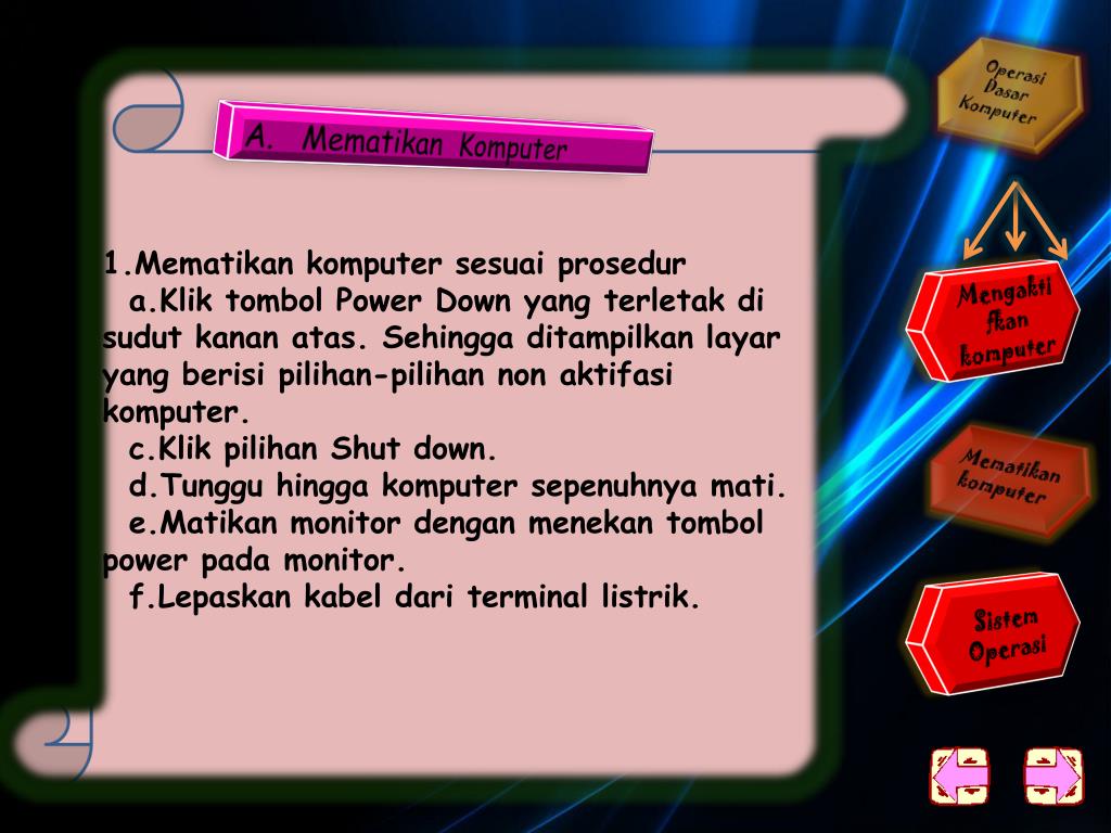 Operasi Dasar Komputer 1.Mematikan komputer sesuai prosedur a.Klik tombol Power Down yang terletak di sudut kanan atas. Sehingga ditampilkan layar yang berisi pilihan-pilihan non aktifasi komputer. c.Klik pilihan Shut down. d.Tunggu hingga komputer sepenuhnya mati. e.Matikan monitor dengan menekan tombol power pada monitor. f.Lepaskan kabel dari terminal listrik. A. Mematikan Komputer Mengaktifkan komputer Mematikan komputer Sistem Operasi