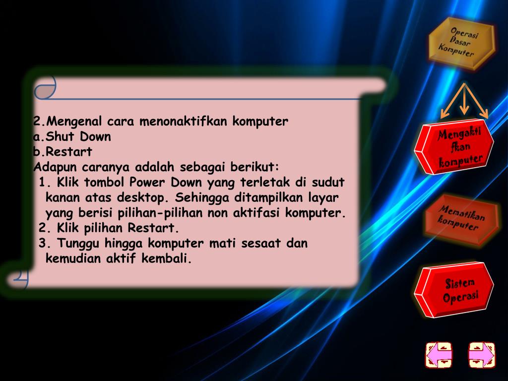 Operasi Dasar Komputer 2.Mengenal cara menonaktifkan komputer Shut Down Restart Adapun caranya adalah sebagai berikut: 1. Klik tombol Power Down yang terletak di sudut kanan atas desktop. Sehingga ditampilkan layar yang berisi pilihan-pilihan non aktifasi komputer. 2. Klik pilihan Restart. 3. Tunggu hingga komputer mati sesaat dan kemudian aktif kembali. Mengaktifkan komputer Mematikan komputer Sistem Operasi