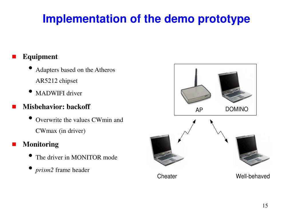 Implementation of the demo prototype • Equipment • Adapters based on the Atheros AR5212 chipset • MADWIFI driver • Misbehavior: backoff • Overwrite the values CWmin and CWmax (in driver) • Monitoring • The driver in MONITOR mode • prism2 frame header