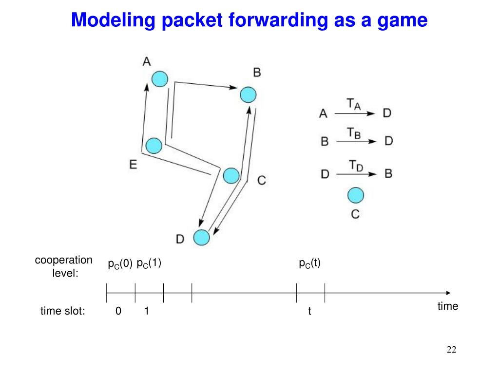 Modeling packet forwarding as a game cooperation level: pC(1) pC(t) pC(0) time time slot: 0 1 t