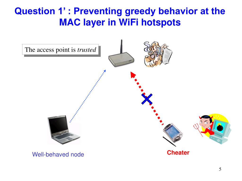 Question 1’ : How do we prevent greedy behavior at the MAC layer in WiFi hotspots ? The access point is trusted Well-behaved node Well-behaved node The MAC layer is fair: if users have similar needs, they obtain a similar share of the bandwidth