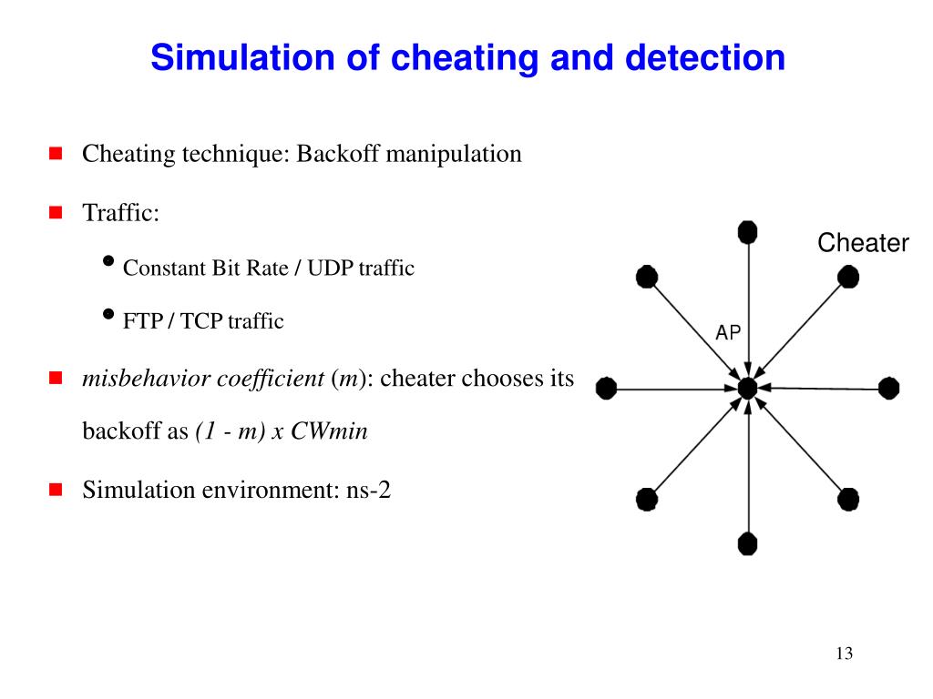 Simulation of cheating and detection • Cheating technique: Backoff manipulation • Traffic: • Constant Bit Rate / UDP traffic • FTP / TCP traffic • misbehavior coefficient (m): cheater chooses its backoff as (1 - m) x CWmin • Simulation environment: ns-2 Cheater
