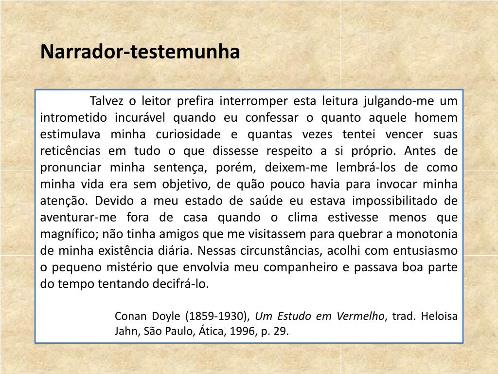 Narrador-testemunha • Talvez o leitor prefira interromper esta leitura julgando-me um intrometido incurável quando eu confessar o quanto aquele homem estimulava minha curiosidade e quantas vezes tentei vencer suas reticências em tudo o que dissesse respeito a si próprio. Antes de pronunciar minha sentença, porém, deixem-me lembrá-los de como minha vida era sem objetivo, de quão pouco havia para invocar minha atenção. Devido a meu estado de saúde eu estava impossibilitado de aventurar-me fora de casa quando o clima estivesse menos que magnífico; não tinha amigos que me visitassem para quebrar a monotonia de minha existência diária. Nessas circunstâncias, acolhi com entusiasmo o pequeno mistério que envolvia meu companheiro e passava boa parte do tempo tentando decifrá-lo. • ConanDoyle (1859-1930), Um Estudo em Vermelho, trad. Heloisa Jahn, São Paulo, Ática, 1996, p. 29.
