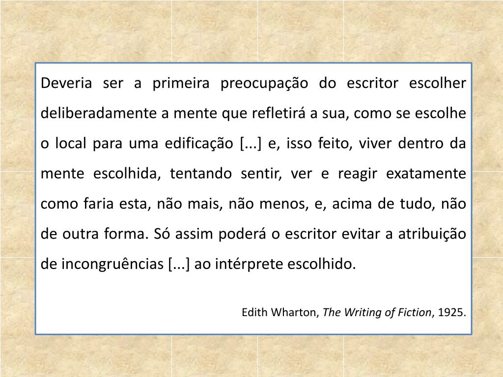 Deveria ser a primeira preocupação do escritor escolher deliberadamente a mente que refletirá a sua, como se escolhe o local para uma edificação [...] e, isso feito, viver dentro da mente escolhida, tentando sentir, ver e reagir exatamente como faria esta, não mais, não menos, e, acima de tudo, não de outra forma. Só assim poderá o escritor evitar a atribuição de incongruências [...] ao intérprete escolhido. Edith Wharton, The Writing of Fiction, 1925.
