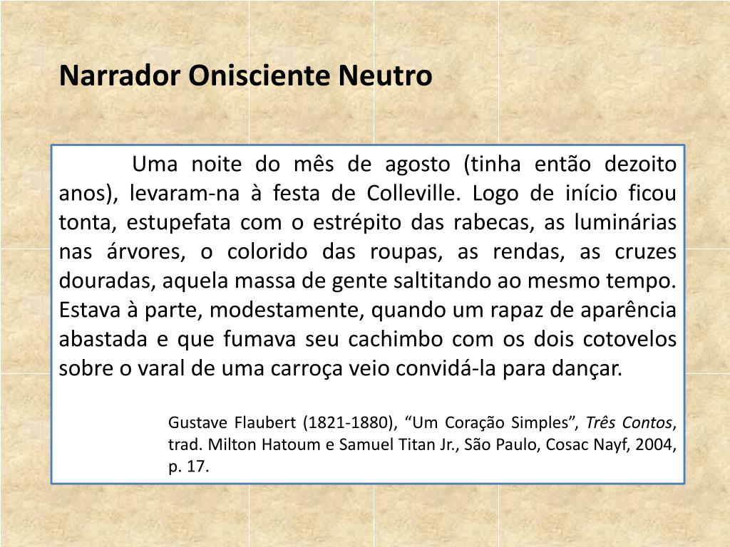 Narrador Onisciente Neutro • Uma noite do mês de agosto (tinha então dezoito anos), levaram-na à festa de Colleville. Logo de início ficou tonta, estupefata com o estrépito das rabecas, as luminárias nas árvores, o colorido das roupas, as rendas, as cruzes douradas, aquela massa de gente saltitando ao mesmo tempo. Estava à parte, modestamente, quando um rapaz de aparência abastada e que fumava seu cachimbo com os dois cotovelos sobre o varal de uma carroça veio convidá-la para dançar. • Gustave Flaubert (1821-1880), “Um Coração Simples”, Três Contos, trad. Milton Hatoum e Samuel Titan Jr., São Paulo, Cosac Nayf, 2004, p. 17.