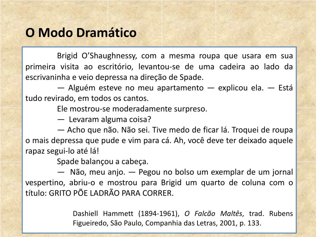 O Modo Dramático • Brigid O’Shaughnessy, com a mesma roupa que usara em sua primeira visita ao escritório, levantou-se de uma cadeira ao lado da escrivaninha e veio depressa na direção de Spade. • — Alguém esteve no meu apartamento — explicou ela. — Está tudo revirado, em todos os cantos. • Ele mostrou-se moderadamente surpreso. • — Levaram alguma coisa? • — Acho que não. Não sei. Tive medo de ficar lá. Troquei de roupa o mais depressa que pude e vim para cá. Ah, você deve ter deixado aquele rapazsegui-lo até lá! • Spade balançou a cabeça. • — Não, meu anjo. — Pegou no bolso um exemplar de um jornal vespertino, abriu-o e mostrou para Brigid um quarto de coluna com o título: GRITO PÕE LADRÃO PARA CORRER. • Dashiell Hammett (1894-1961), O Falcão Maltês, trad. Rubens Figueiredo, São Paulo, Companhia das Letras, 2001, p. 133.