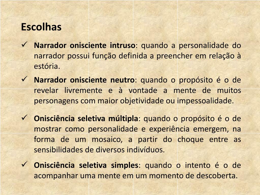 Escolhas • Narrador onisciente intruso: quando a personalidade do narrador possui função definida a preencher em relação à estória. • Narrador onisciente neutro: quando o propósito é o de revelar livremente e à vontade a mente de muitos personagens com maior objetividade ou impessoalidade. • Onisciência seletiva múltipla: quando o propósito é o de mostrar como personalidade e experiência emergem, na forma de um mosaico, a partir do choque entre as sensibilidades de diversos indivíduos. • Onisciência seletiva simples: quando o intento é o de acompanhar uma mente em um momento de descoberta.