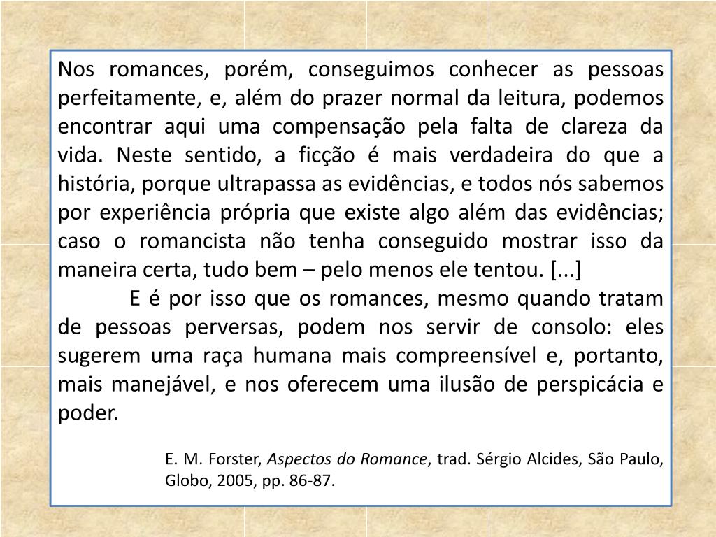 Nos romances, porém, conseguimos conhecer as pessoas perfeitamente, e, além do prazer normal da leitura, podemos encontrar aqui uma compensação pela falta de clareza da vida. Neste sentido, a ficção é mais verdadeira do que a história, porque ultrapassa as evidências, e todos nós sabemos por experiência própria que existe algo além das evidências; caso o romancista não tenha conseguido mostrar isso da maneira certa, tudo bem – pelo menos ele tentou. [...] • E é por isso que os romances, mesmo quando tratam de pessoas perversas, podem nos servir de consolo: eles sugerem uma raça humana mais compreensível e, portanto, mais manejável, e nos oferecem uma ilusão de perspicácia e poder. • E. M. Forster, Aspectos do Romance, trad. SérgioAlcides, São Paulo, Globo, 2005, pp. 86-87.