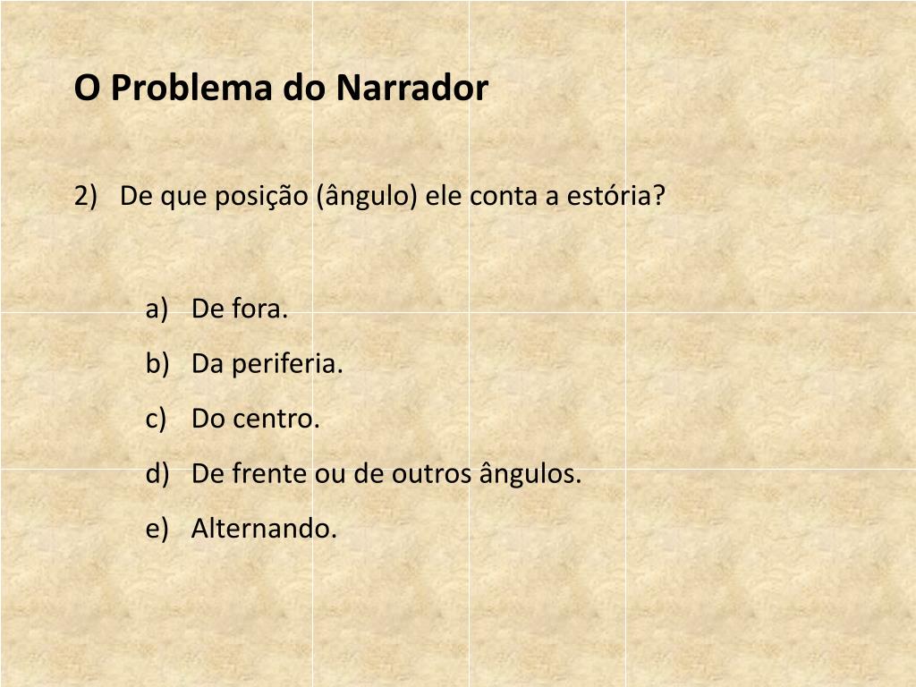 O Problema do Narrador De que posição (ângulo) ele conta a estória? De fora. Da periferia. Do centro. De frente ou de outros ângulos. Alternando.