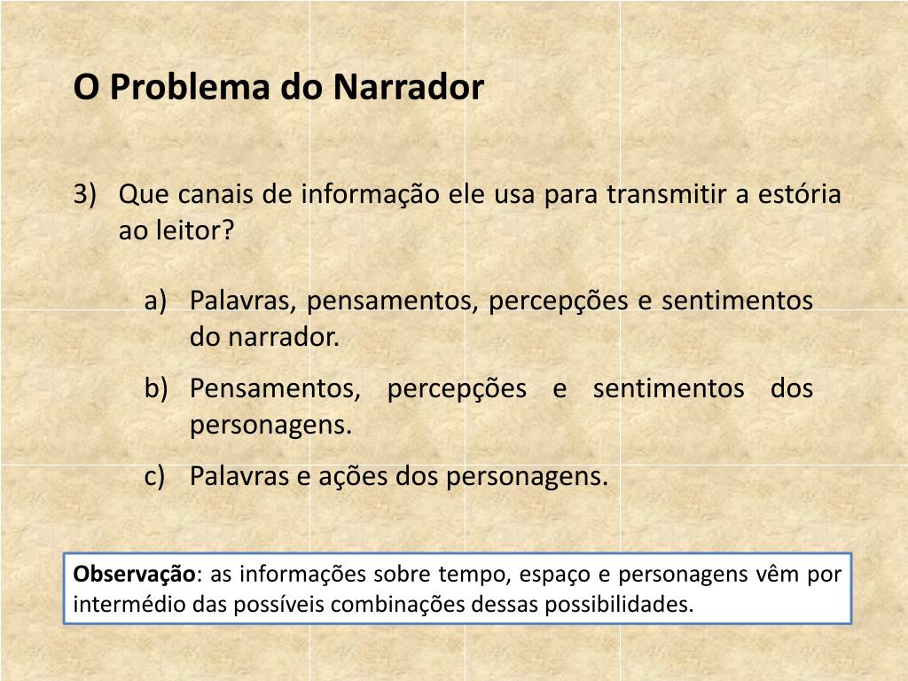O Problema do Narrador Que canais de informação ele usa para transmitir a estória ao leitor? • Palavras, pensamentos, percepções e sentimentosdo narrador. • Pensamentos, percepções e sentimentos dos personagens. • Palavras e ações dos personagens. Observação: as informações sobre tempo, espaço e personagens vêm por intermédio das possíveis combinações dessas possibilidades.