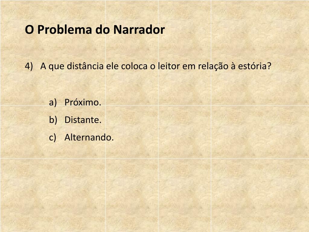 O Problema do Narrador A que distância ele coloca o leitor em relação à estória? • Próximo. • Distante. • Alternando.