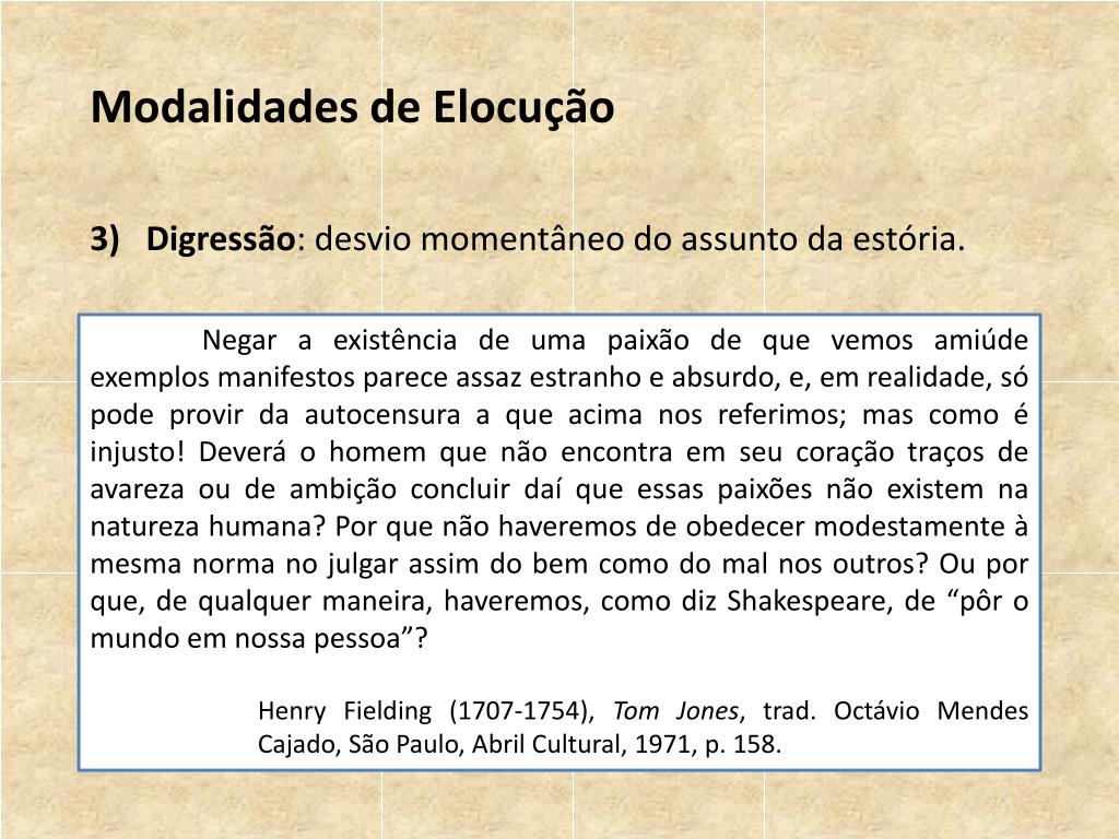 Modalidades de Elocução Digressão: desvio momentâneo do assunto da estória. • Negar a existência de uma paixão de que vemos amiúde exemplos manifestos parece assaz estranho e absurdo, e, em realidade, só pode provir da autocensura a que acima nos referimos; mas como é injusto! Deverá o homem que não encontra em seu coração traços de avareza ou de ambição concluir daí que essas paixões não existem na natureza humana? Por que não haveremos de obedecer modestamente à mesma norma no julgar assim do bem como do mal nos outros? Ou por que, de qualquer maneira, haveremos, como diz Shakespeare, de “pôr o mundo em nossa pessoa”? • Henry Fielding (1707-1754), Tom Jones, trad. Octávio Mendes Cajado, São Paulo, Abril Cultural, 1971, p. 158.