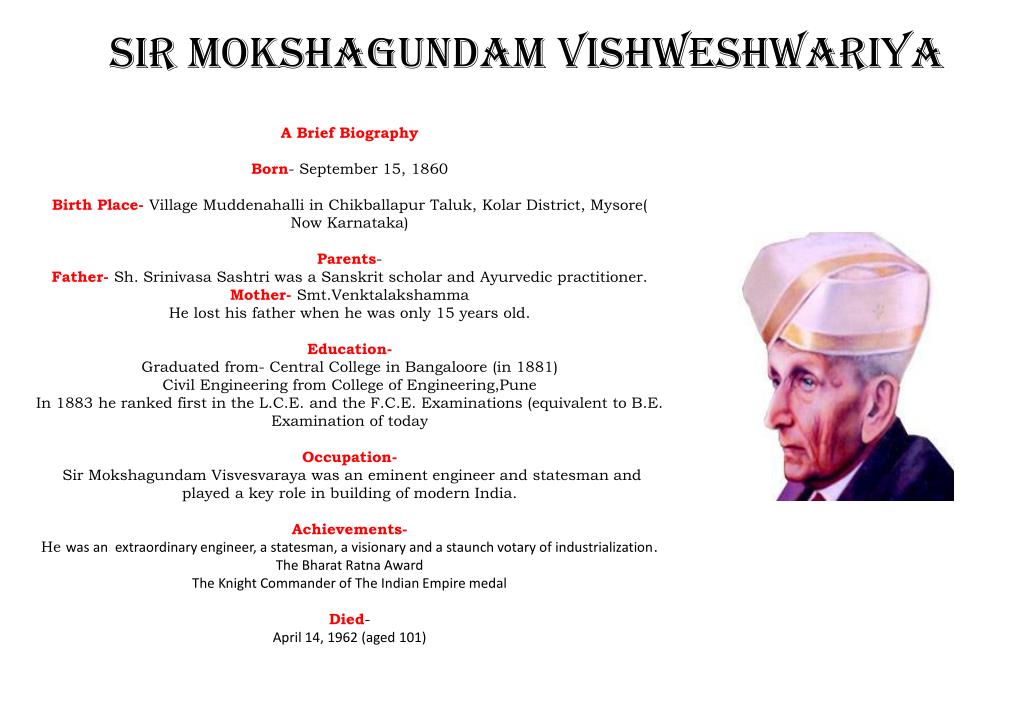 Sir Mokshagundam Vishweshwariya. A Brief Biography Born - September 15 , 1860 Birth Place- V illage Muddenahalli in Chikballapur Taluk, Kolar District, Mysore( Now Karnataka) Parents - F ather- Sh. Srinivasa Sashtri was a Sanskrit scholar and Ayurvedic practitioner.