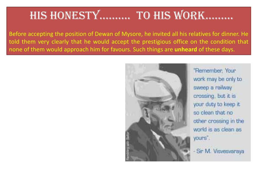 His Honesty………. To his work……… Before accepting the position of Dewan of Mysore, he invited all his relatives for dinner. He told them very clearly that he would accept the prestigious office on the condition that none of them would approach him for favours. Such things are unheardof these days.