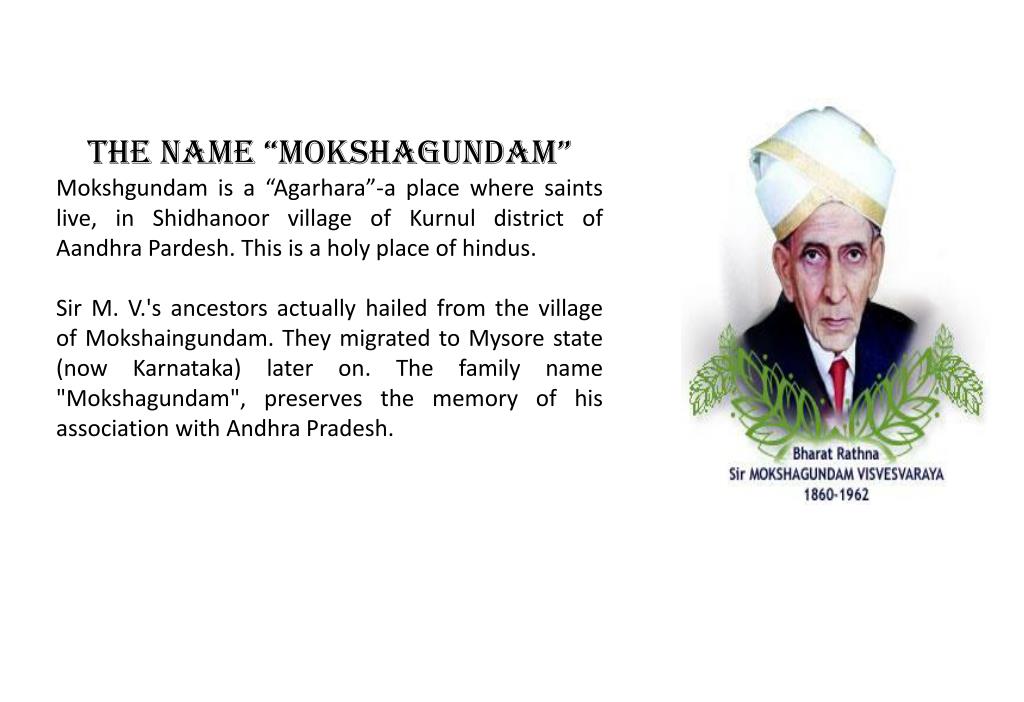 The name “MOKSHAGUNDAM” Mokshgundam is a “Agarhara”-a place where saints live, in Shidhanoor village of Kurnul district of Aandhra Pardesh. This is a holy place of hindus. Sir M. V.'s ancestors actually hailed from the village of Mokshaingundam. They migrated to Mysore state (now Karnataka) later on. The family name "Mokshagundam", preserves the memory of his association with Andhra Pradesh.