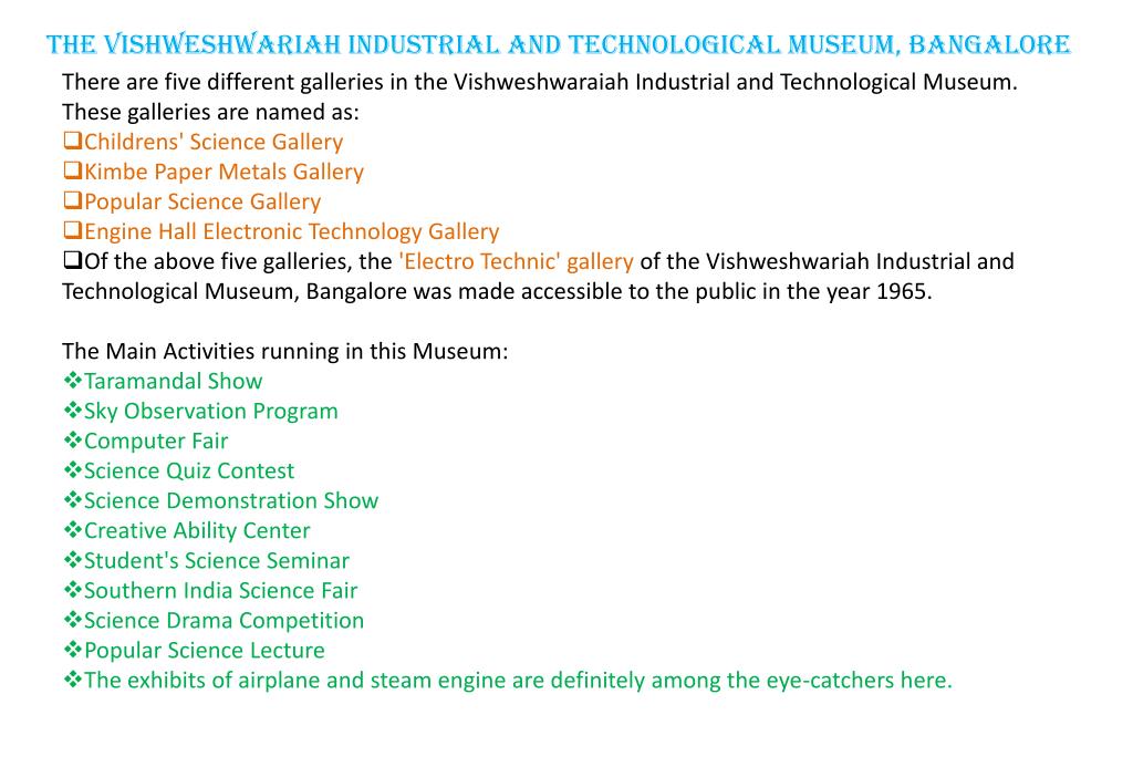 The Vishweshwariah Industrial and Technological Museum, Bangalore • There are five different galleries in the Vishweshwaraiah Industrial and Technological Museum. These galleries are named as: • Childrens' Science Gallery • Kimbe Paper Metals Gallery • Popular Science Gallery • Engine Hall Electronic Technology Gallery • Of the above five galleries, the 'Electro Technic' gallery of the Vishweshwariah Industrial and Technological Museum, Bangalore was made accessible to the public in the year 1965. The Main Activities running in this Museum: • Taramandal Show • Sky Observation Program • Computer Fair • Science Quiz Contest • Science Demonstration Show • Creative Ability Center • Student's Science Seminar • Southern India Science Fair • Science Drama Competition • Popular Science Lecture • The exhibits of airplane and steam engine are definitely among the eye-catchers here.